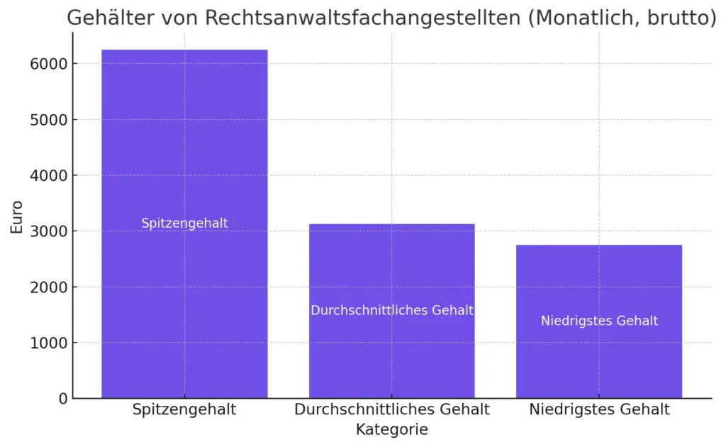 - Durchschnittliches Gehalt für Rechtsanwaltsfachangestellte: ca. 3.000–3.250 € brutto/Monat (36.000–39.000 € brutto/Jahr)